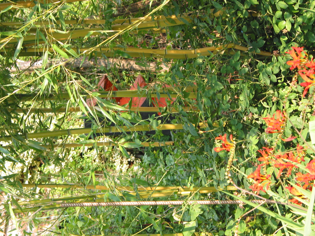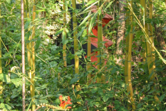 Durchblicke auf Holzskulptur (vor gelbem Bambus)