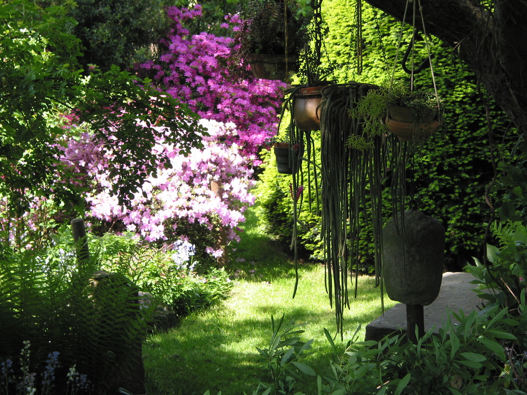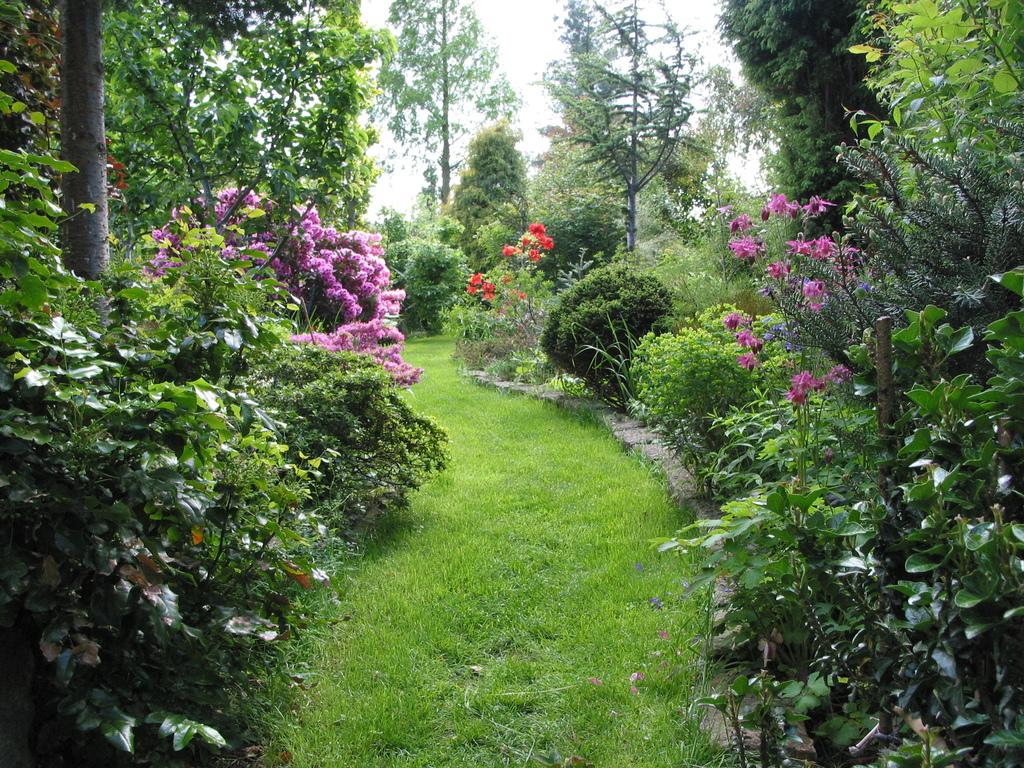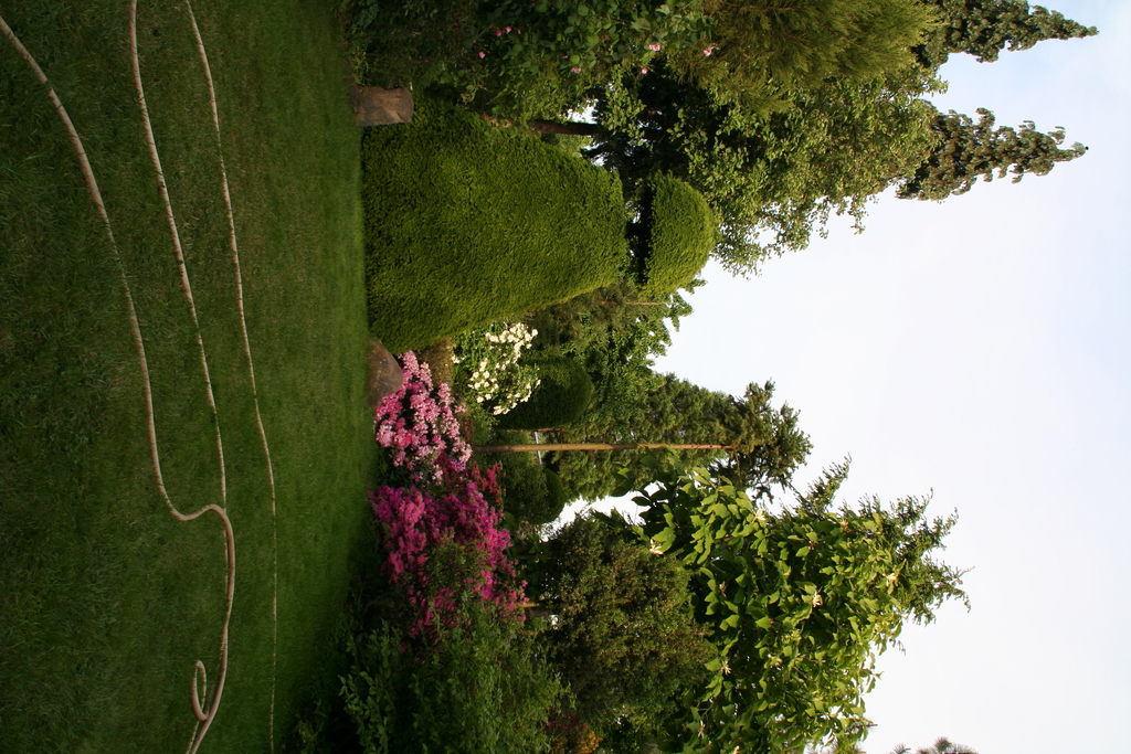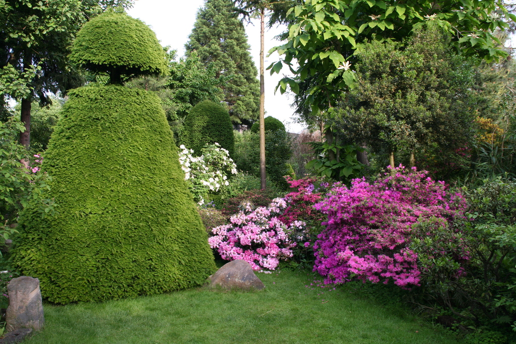 Gartenansicht mit Rhodendron, Buxus und Schlauch
