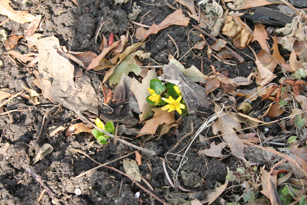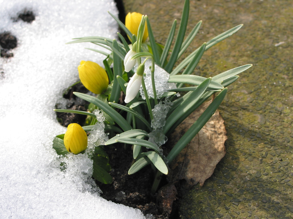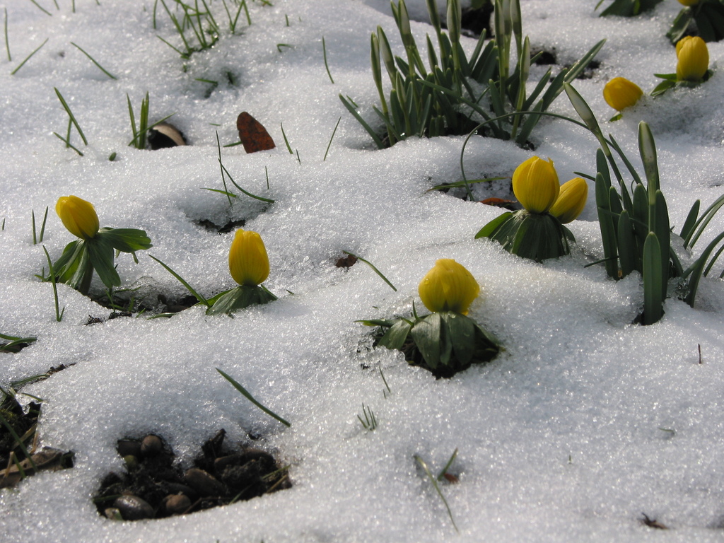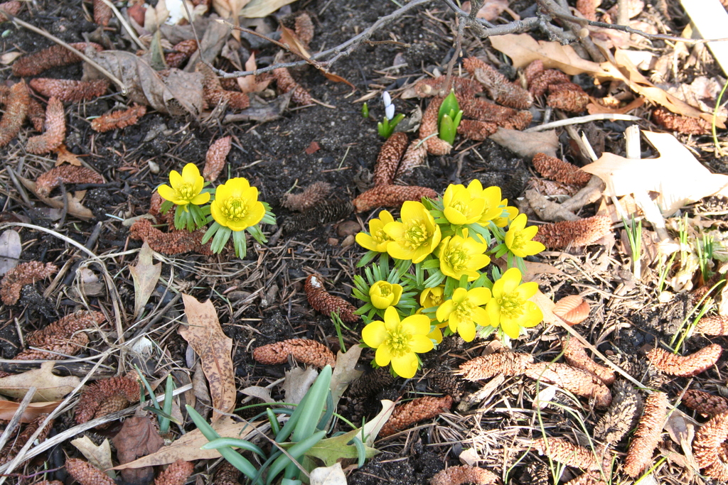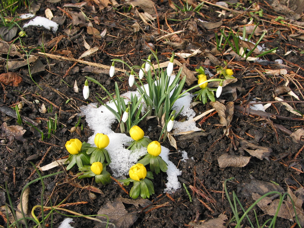 spätwinterlicher Garten mit Krokussen und Winterlingen