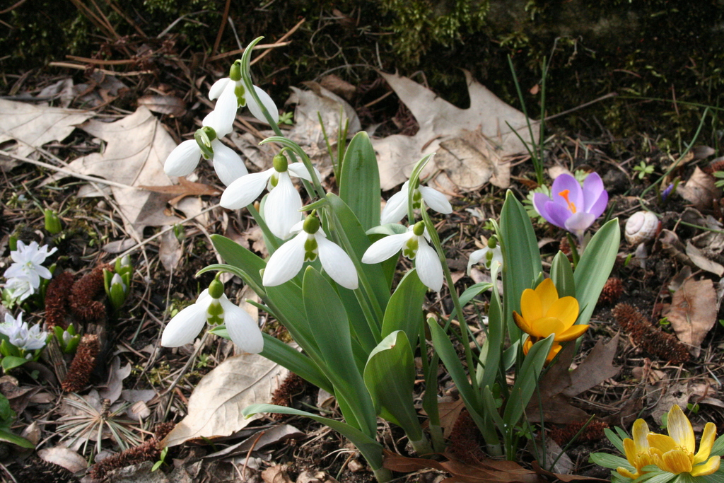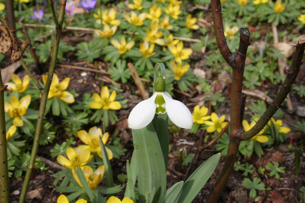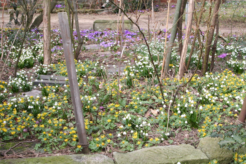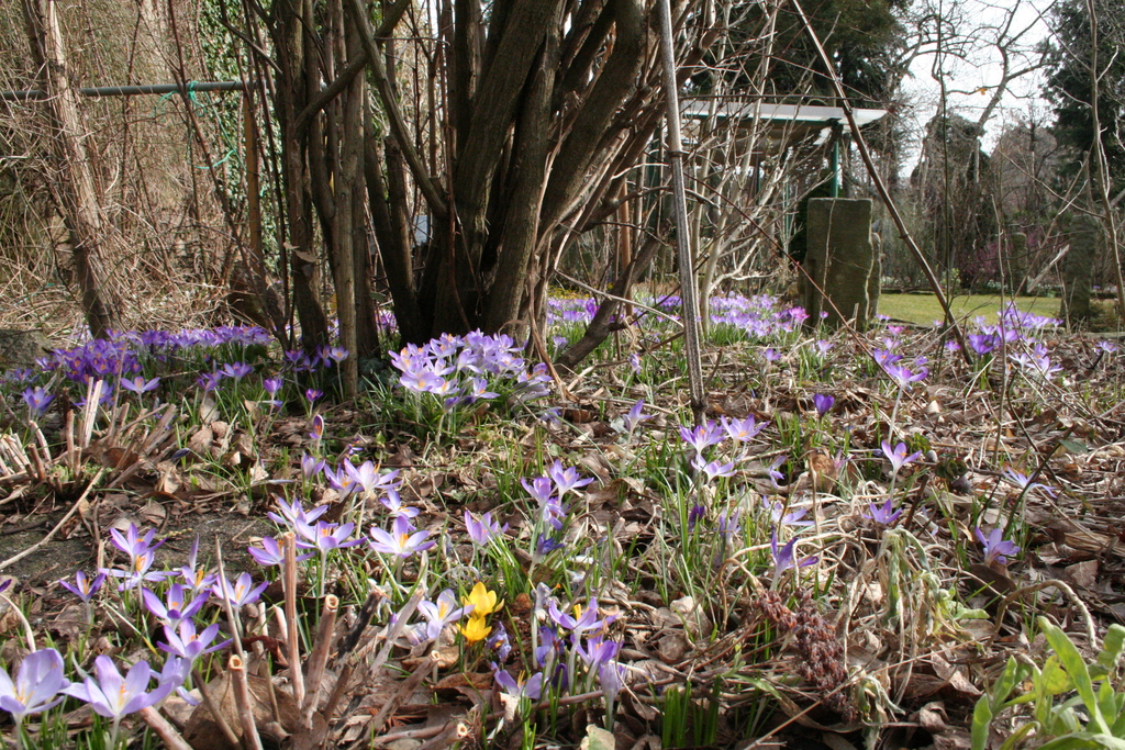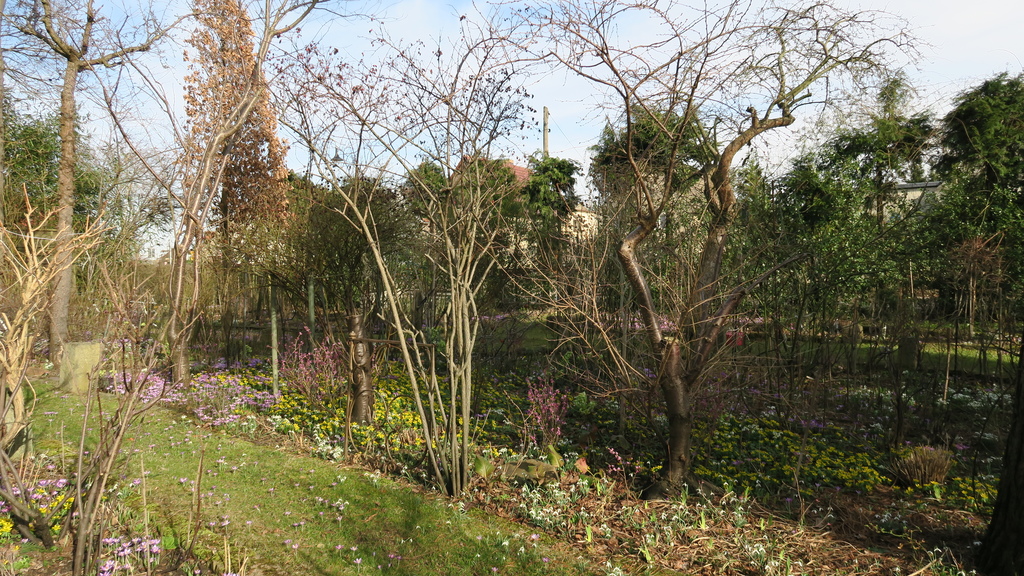 Krokusse, Märzenbecher, Schneeglöckchen und Winterlinge bedecken große Flächen im Garten